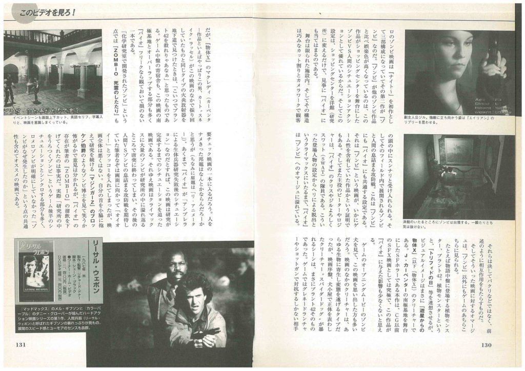 市川大賀さんコメント「『ポリスノーツ』『メタルギアソリッド』等のゲームを産んだ小島秀夫監督と『バイオハザード』シリーズ。洋画のSFとアクションジャンルへのオマージュをガンガン自作ゲームに積み上げる方程式でゲームを作っていた時代の小島監督と、とにかくゾンビエンタメの基礎の基本の、ジョージ・A・ロメロ監督のゾンビ映画を始めとした、特殊メイクホラー映画へのオマージュで溢れていた『バイオハザード』の両雄を取り上げて(他も取り上げ始めると、ガチで8ぺージごときではおさまりがつかなくなるので)、徹底的にその二者の作品の中にある「元ネタ映画」を、紹介していこうという企画をぶち上げました。」