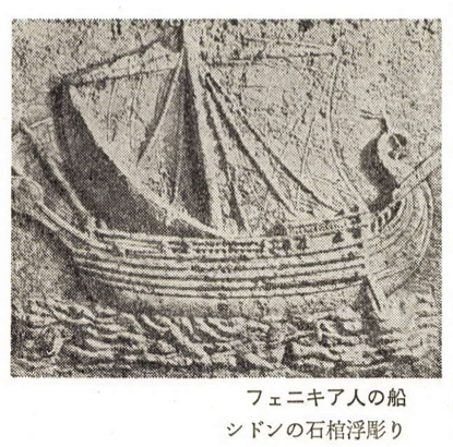 この女をフェニキアのペテン師船乗りは誘惑して、うつろに刳[く]った船の陰に連れて行き情を通じる。「うつろに刳った」とあるから極く幼稚な丸木舟であったと想像されるが、ベイルートの博物館にあるブローンズ製の船の模型で大体その姿が想像できる。この船は丸木をくり抜いた部分を底辺にしてその上に板をしっかりと取りつけた構造船であったろうと見当はつくが、実物の大きさについては正確にはわからぬものの、古代日本の遣唐使が乗ったとされる二十人乗りの程度のものであろうか。